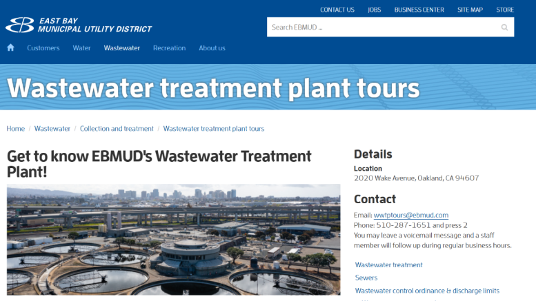 イーストベイ水道局の汚水施設ツアーが人気(EBMUD)の汚水処理施設は年間数回、一般市民に見学ツアーの機会を提供している。この施設は1日平均5000万ガロンの未処理汚水を処理しており、見学者は「強い臭い」を覚悟するよう警告される。ツアーでは、オークランドを含む東ベイエリアの740,000人を対象に、家庭、商業施設、工業施設からの汚水を処理するプロセスが紹介される。施設は地理的に海面に位置し、重力によって汚水が運ばれる仕組みである。