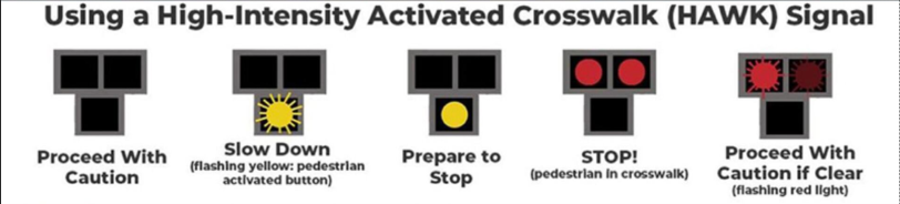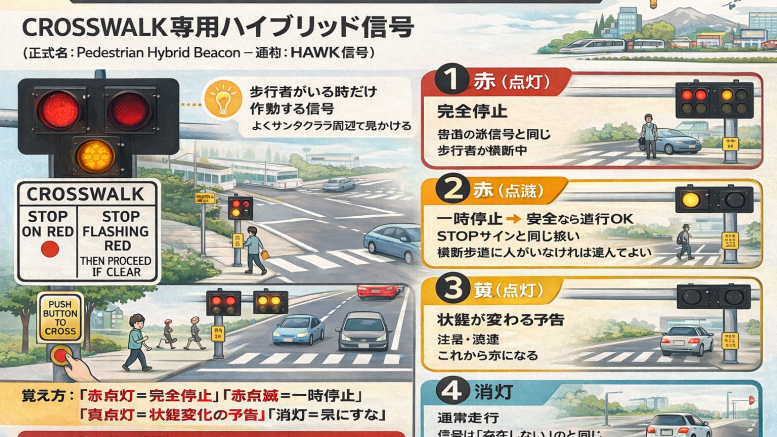 この信号の正体は、Pedestrian Hybrid Beacon。通称 HAWK信号 と呼ばれる、横断歩道専用の信号システムです。