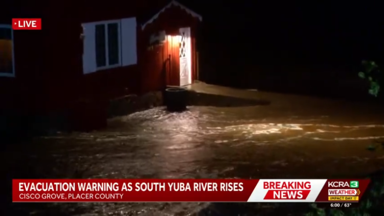 Cisco Grove地域で南ユバ川の洪水により避難警告が発令されている。洪水は特にCiscoとDonner Pass Roadsの間で発生しており、インターステート80に隣接する。洪水の影響で、Hampshire Rocks Roadに位置する赤い家から午後1時15分頃に8名が避難した。周辺には照明が点いているが無人の家もあり、水位が上昇している状況である。