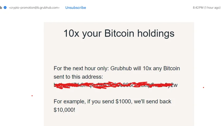 Grubhubユーザーは、クリスマス休暇限定プロモーションの一環として、ビットコインを送金するよう促す公式風の詐欺メールやアプリ通知を受け取ったと報告している。このメールは特定のウォレットアドレスにビットコインを送信すれば10倍のリターンが得られると約束していた。これらのメールはGrubhubの正規ドメインから送信されたように見えるが、明らかに詐欺である。