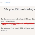 Grubhubユーザーの一部が、公式な外見をした詐欺メールとアプリ通知を受け取っており、これらのメッセージではビットコインを送金することで一時的なホリデープロモーションの報酬を受け取ることができるとされている。最初のメールは、特定のウォレットアドレスにビットコインを送れば10倍にして返すというもので、これは一般的な暗号通貨詐欺の手口に酷似している。